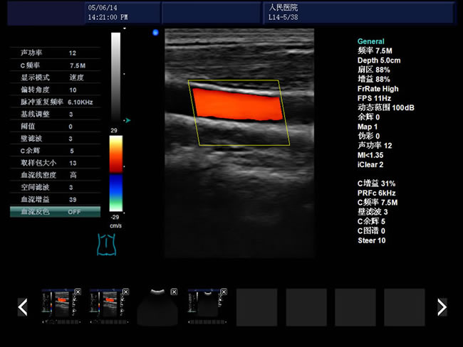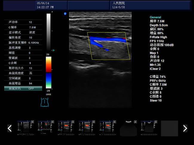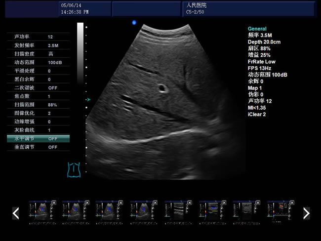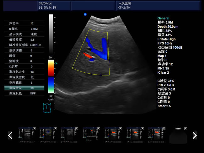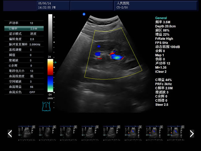頻率、幀頻、B模式總增益、C模式總增益、D模式總增益、菜單、注釋、灰階帶、穿刺引導(dǎo)線、PRF、壁濾波、血流相關(guān)、累積次數(shù)、TI熱指數(shù)、MI機(jī)械指數(shù)