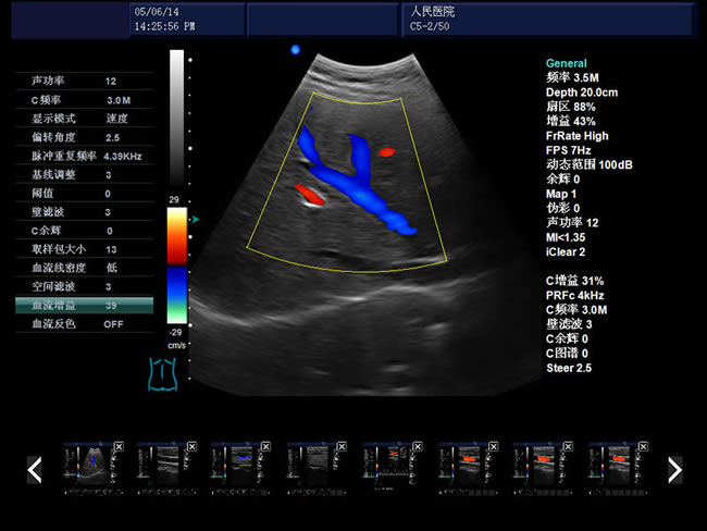 彩色血流圖像調(diào)節(jié)參數(shù):多普勒頻率、取樣框位置和大小、基線、彩色增益、偏轉(zhuǎn)角度、壁濾波、累積次數(shù)等。