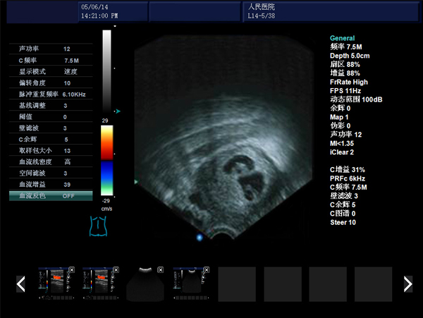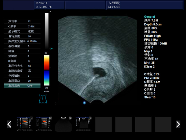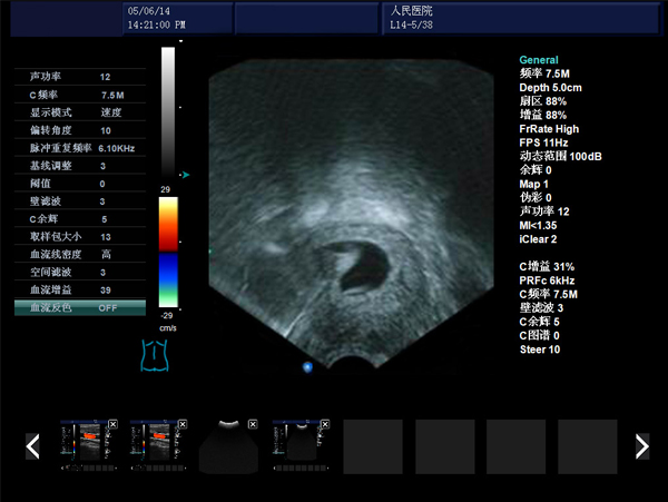 彩色血流圖像調(diào)節(jié)參數(shù):多普勒頻率、取樣框位置和大小、基線、彩色增益、偏轉(zhuǎn)角度、壁濾波、累積次數(shù)等。